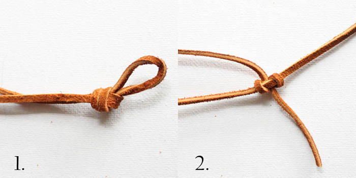 Step 1: (to find the length of cord you need to fit your wrist) Fold the leather cord in half and make a knot at the end. Make sure your button can pass through the hole. It’s okay if the fit is a little tight. The leather will stretch over time.