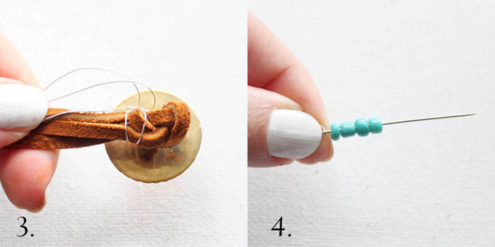 Step 3: Knot the button on to end of the leather cord. Then wrap the bead stringing wire around the end and make a double knot.
