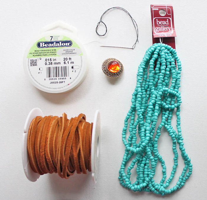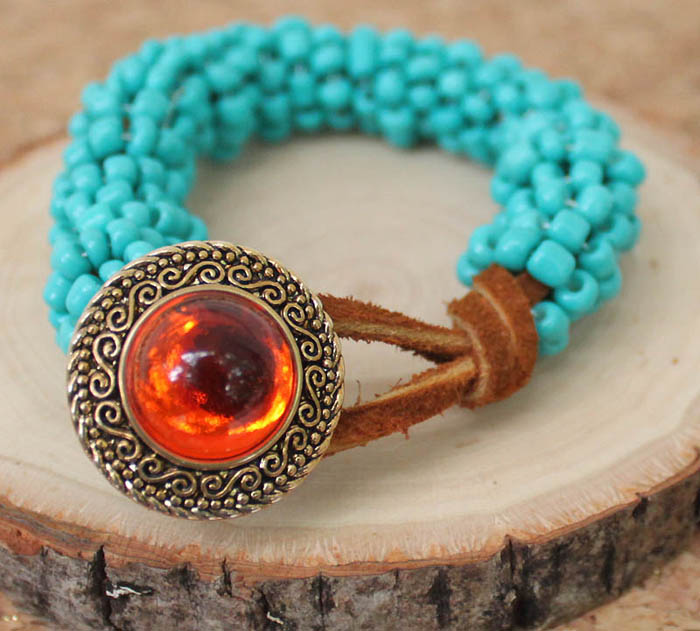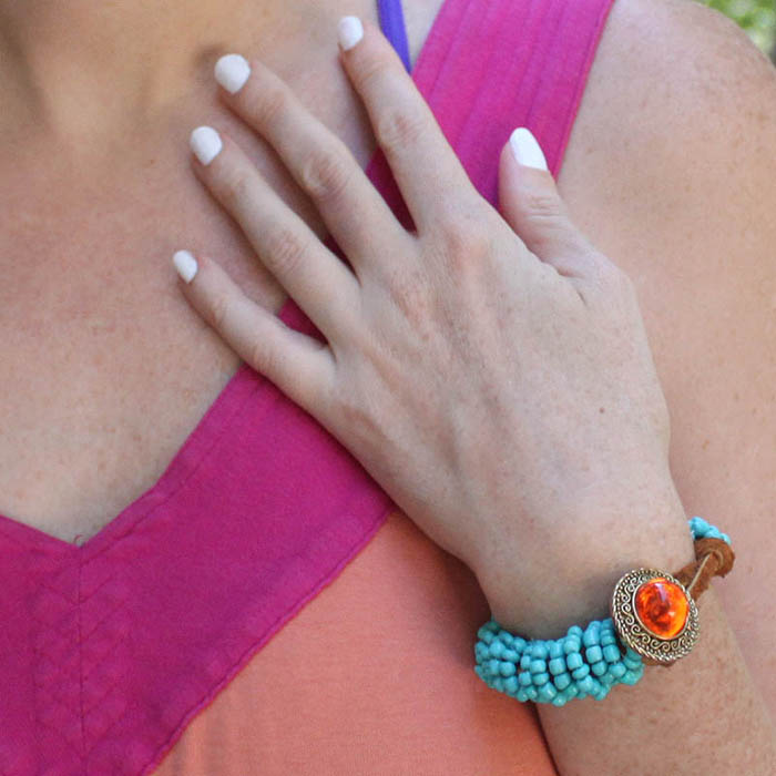 Turquoise and leather are a classic combo and the large button closure really makes this a stand-out piece. This DIY bracelet is the perfect combination of bohemian and glam! The design would look great on its own or stacked with other bracelets. Best of all, it’s really easy to make. Read below to find out how!
