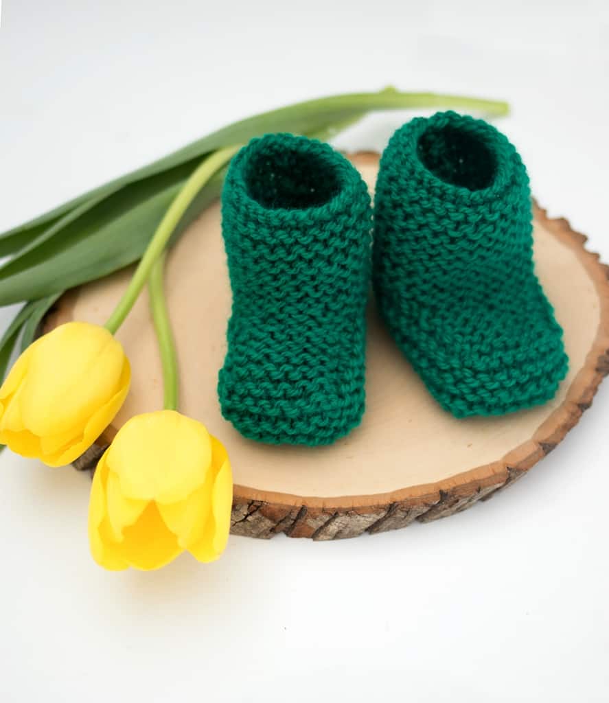 Garter stitch booties are particularly popular for beginners because the stitch pattern is simple and forgiving.
